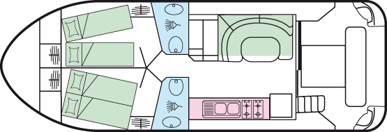 • Doppelbett im Bug, Doppel- oder 2 Einzelbetten in den beiden Kabinen mittschiffs
